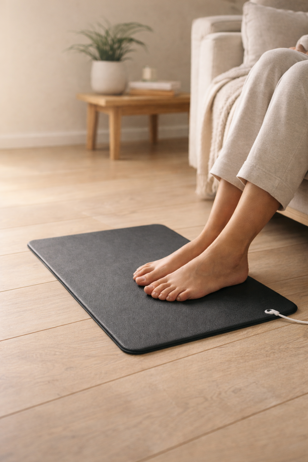 Traditional grounding requires walking barefoot outdoors—not always easy during a busy workday or a cold winter. The Rooted Restore Mat brings that same natural connection right into your home with a durable, water-resistant design and a generous 15-foot cord.